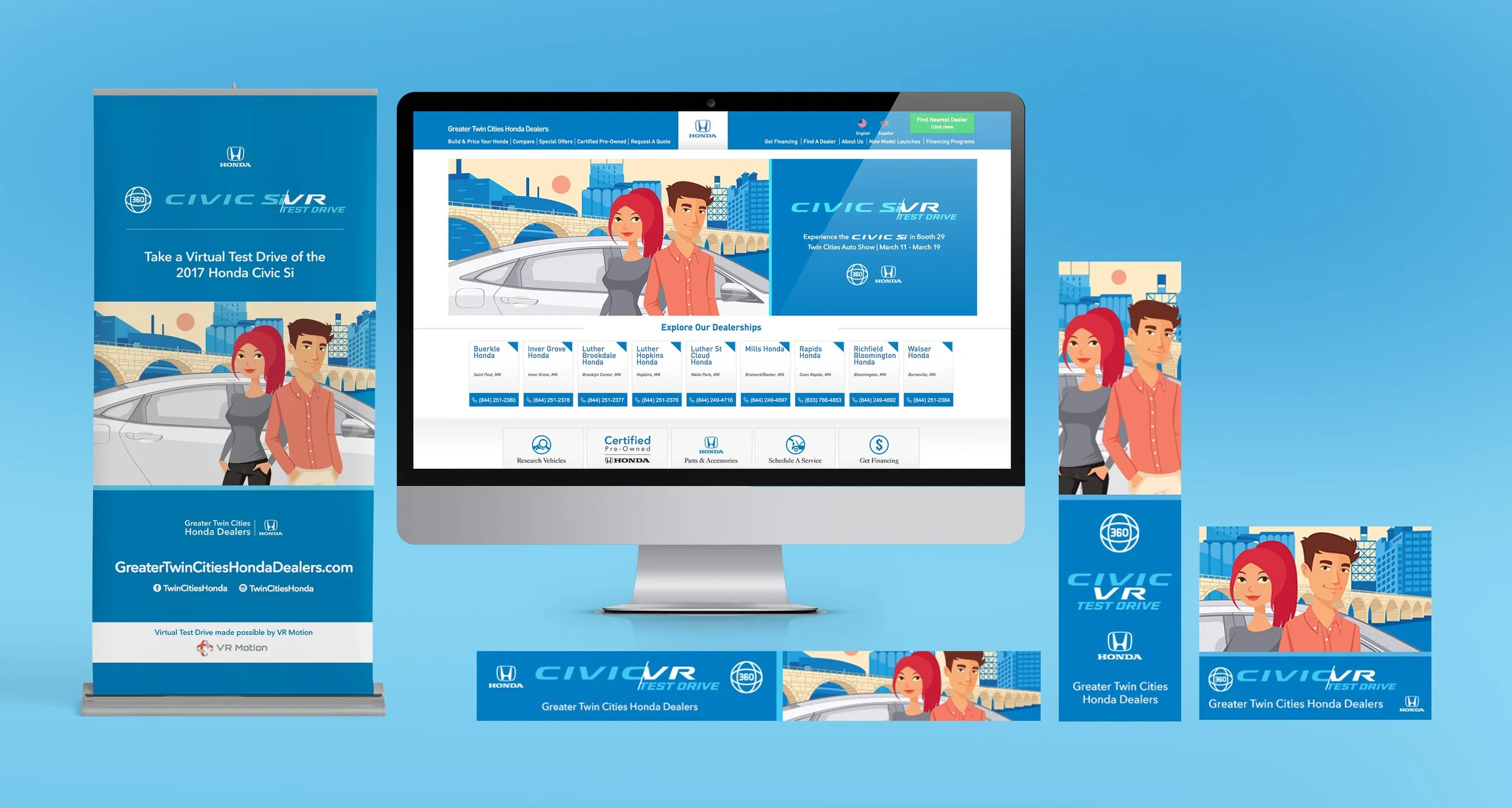 The Association of Greater Twin Cities Honda Dealers hosted a booth at the Twin Cities Auto Show and needed to engage with the public. By leveraging the new virtual reality trend, handheld VR viewers compatible with mobile phones have been developed. A test drive experience in 360 video format was filmed with two Actors, allowing for multiple-choice experiences. Online display advertising and social promotion directed customers to a landing page with more details. Print materials were also developed to be onsite at the event itself. To take the experience further, we partnered with VR Motion® to emulate a complete driving experience behind the wheel. This provided a fully immersive, interactive experience for the audience and generated the attention they were seeking. The event created a memorable experience and attracted potential customers.